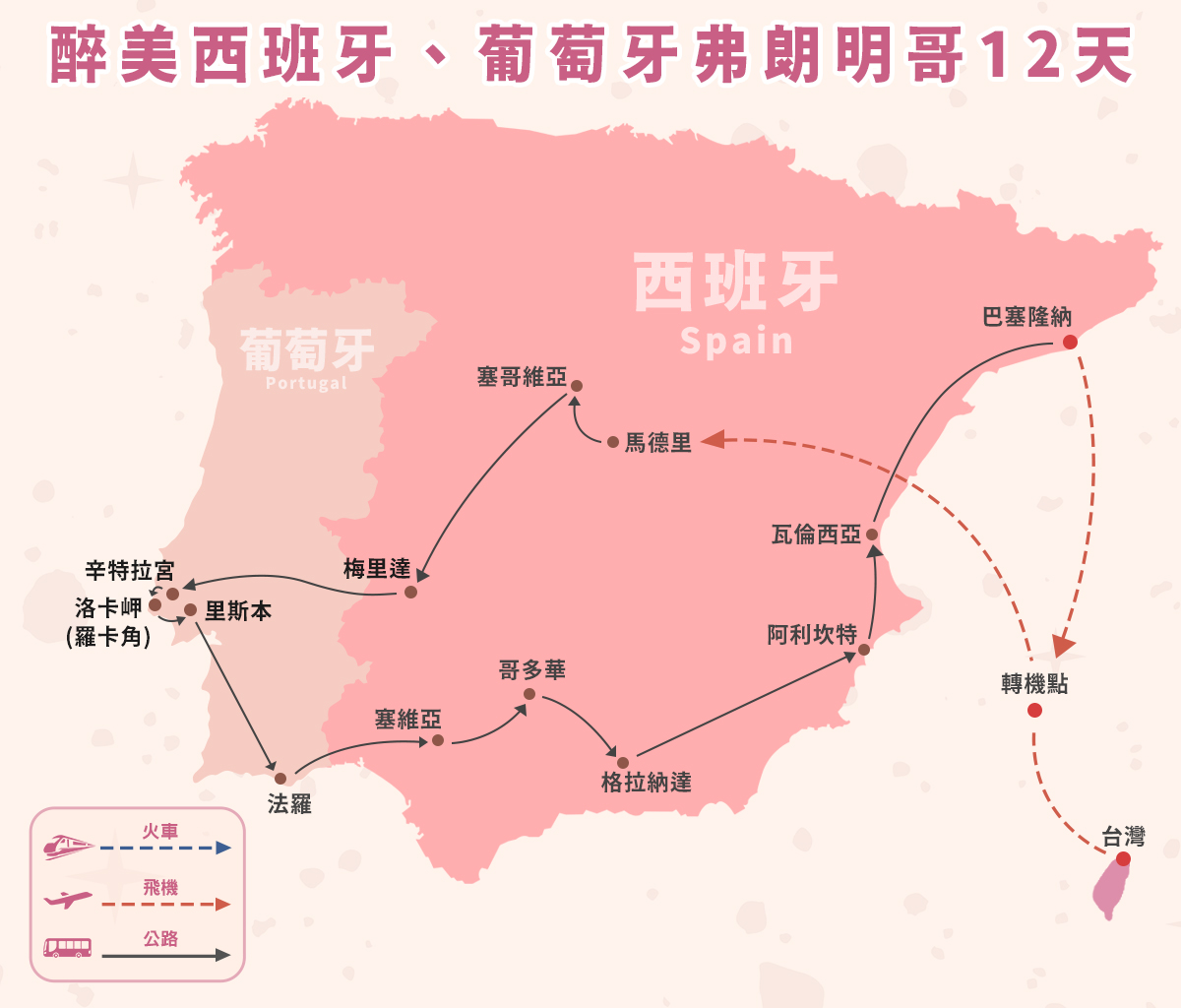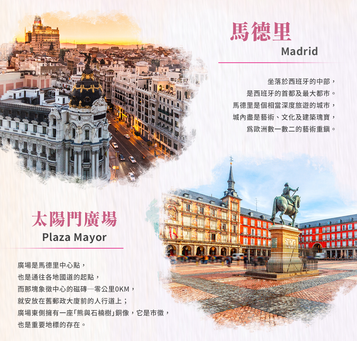 今日帶著愉快雀躍的心情於桃園機場集合,辦理登機手續後,搭乘經上海轉機飛往陽光國度-西班牙首都:馬德里,一趟浪漫熱情的饗宴也隨之開始;準備迎接美好的南歐之旅!