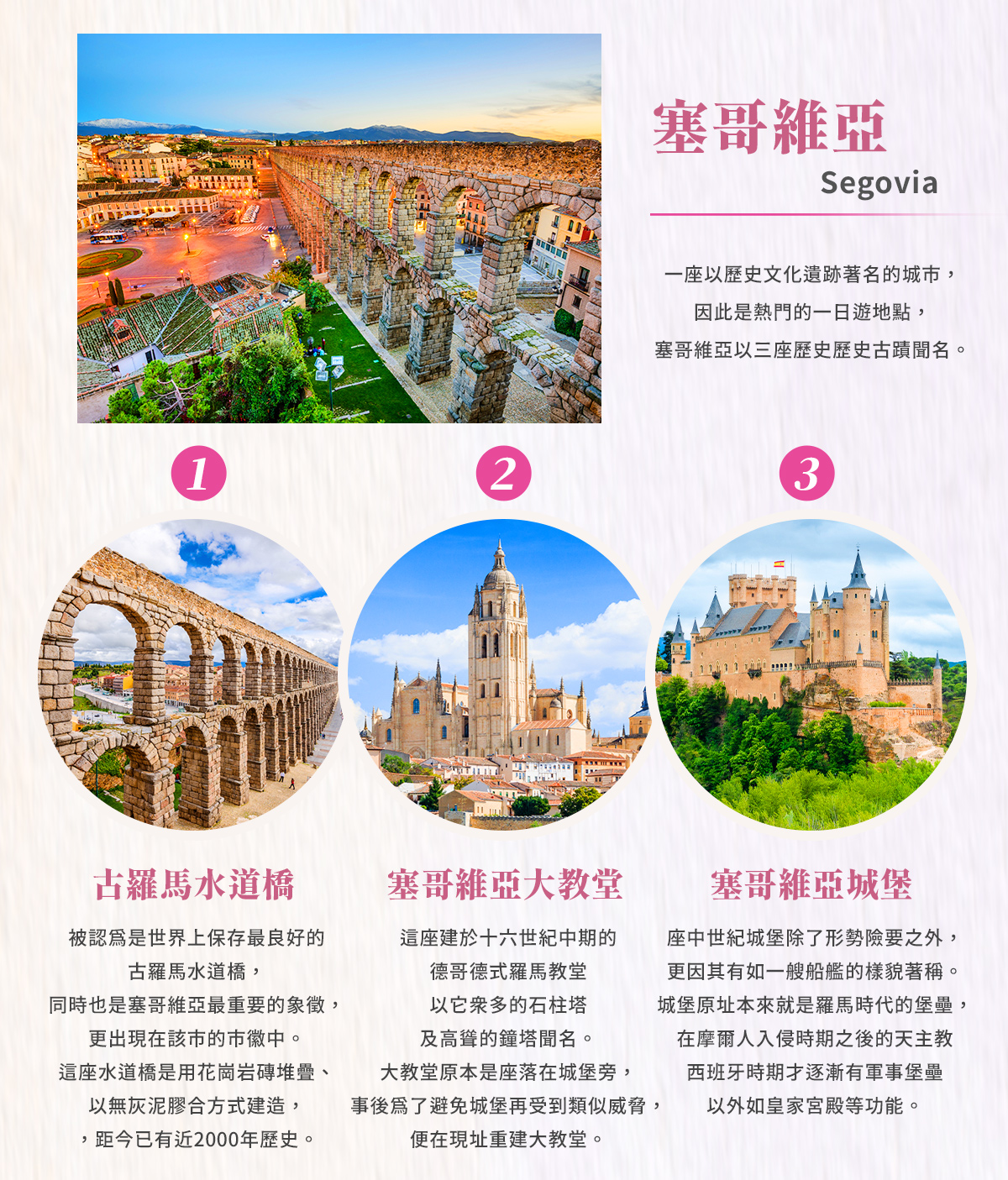 賽哥維亞的水道橋與法國的Pont du Gard被認為是世界上保存最良好的古羅馬水道橋,同時也是塞哥維亞最重要的象徵,更出現在該市的市徽中。這座高近30公尺的水道橋據信建於西元112年,距今已有近2000年歷史。這座水道橋是用花崗岩磚堆疊、以無灰泥膠合方式建造。水道橋過去一度綿延15公里長,並以1%的坡度,替這座城市引入了水源。今日,城中的水道橋仍有818公尺長,但已經不再引水。