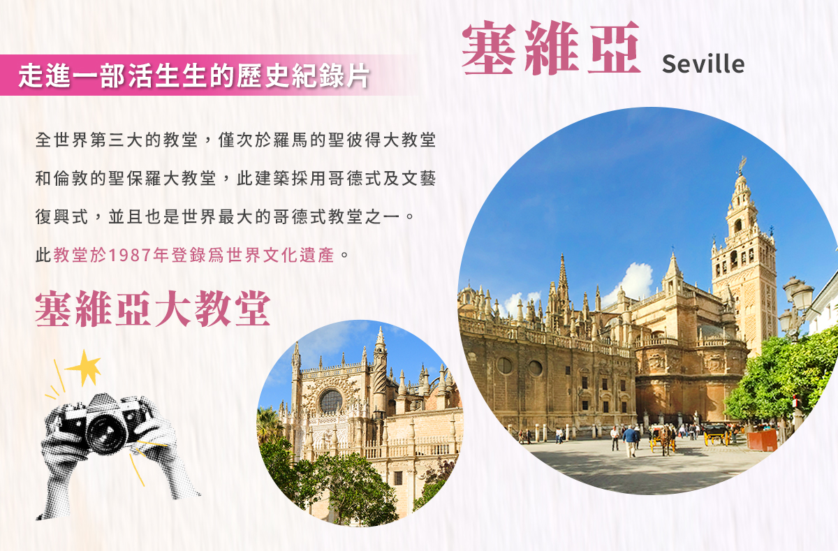 對於穆是全世界第三大的教堂,僅次於羅馬的聖彼得大教堂和倫敦的聖保羅大教堂,此建築採用哥德式及文藝復興式,並且也是世界最大的哥德式教堂之一。大航海家-哥倫布的靈柩長眠於此,以供後世景仰;此教堂於1987年登錄為世界文化遺產。(如遇宗教節日及週日彌撒日因而關門,則改安排參觀塞維亞阿卡薩城堡)