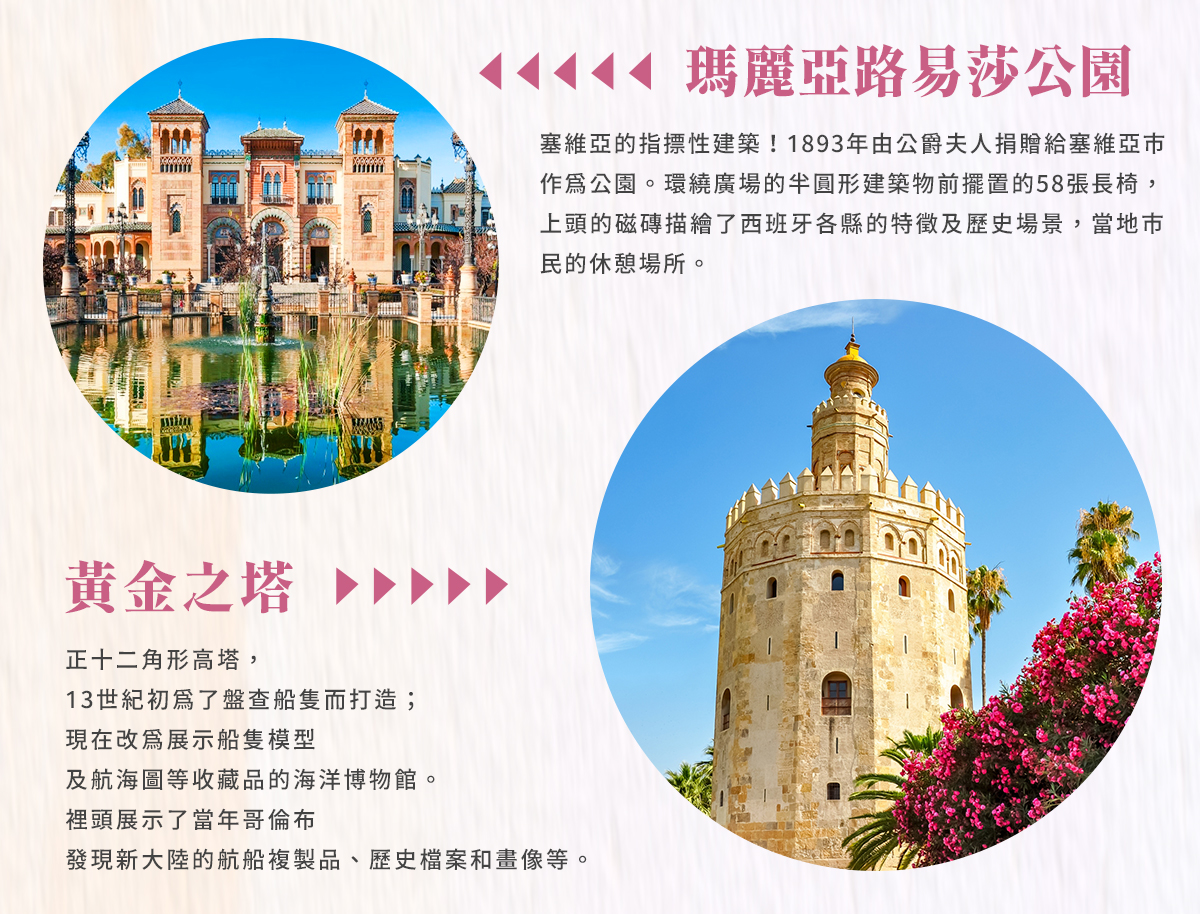 塞維亞的指摽性建築!1893年由公爵夫人捐贈給塞維亞市作為公園。環繞廣場的半圓形建築物前擺置的58張長椅,上頭的磁磚描繪了西班牙各縣的特徵及歷史場景。當地市民的休憩場所,留有全國最大、也是當年為了舉辦萬國博覽會所建的主場地,兩旁有著古典的噴泉迴廊。