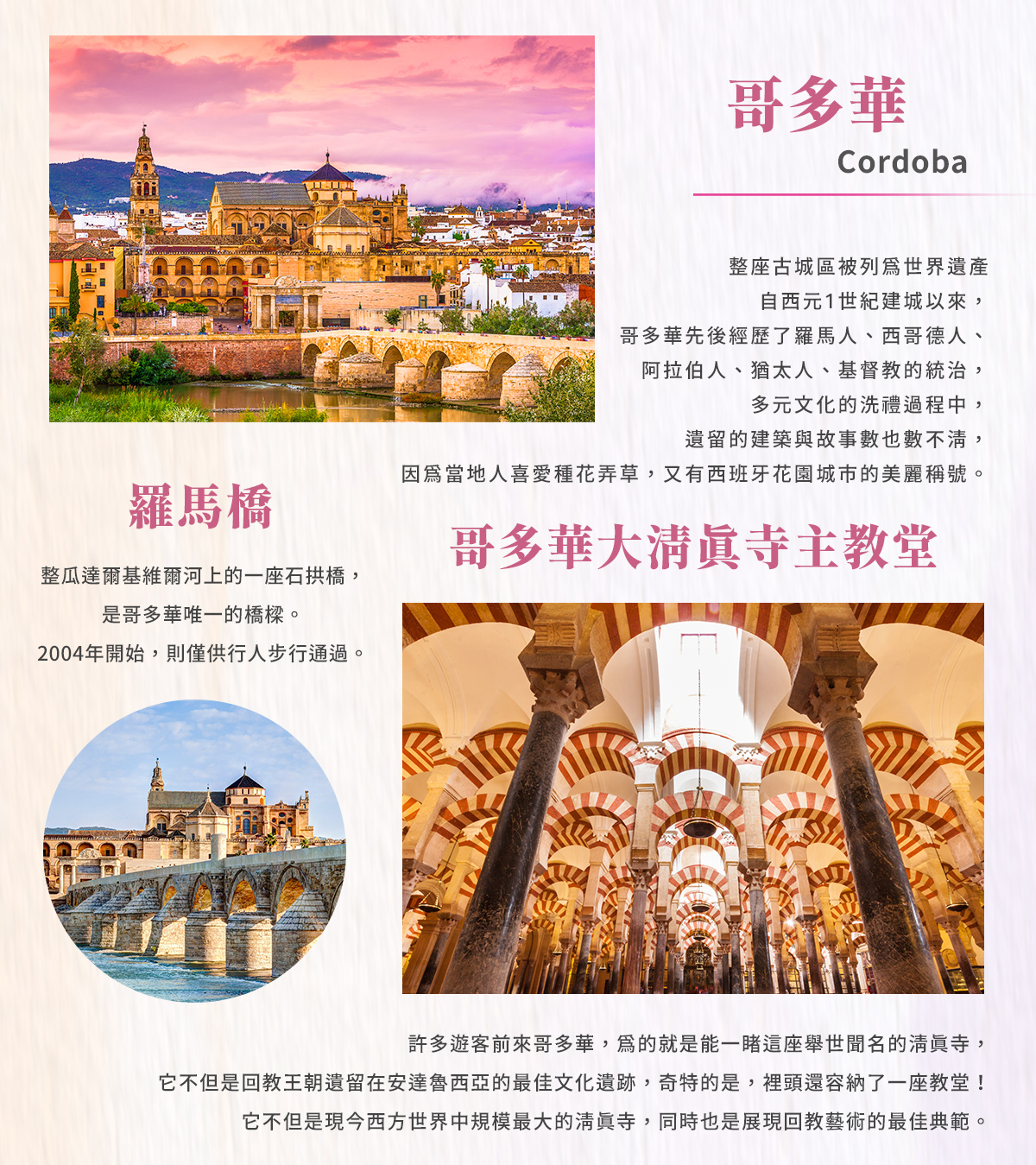 8世紀開始摩爾人佔領西班牙,鼎盛時期哥多華成為一個非常重要的集合中心,是昔日為伊斯蘭教的首都,城內有超過300座的清真寺、數不清的宮殿與公共建築,當時與君士坦丁堡、大馬士革、巴格達的繁榮相媲美。股城外的羅馬橋挺立於人世間達2000年之久。我們漫步於古城、帶您走入百花巷,四處盡是牆上佈滿繽紛茂盛花盆的屋舍,而猶太區如迷宮的小街小巷,每個轉角處都是另一個風情,充滿歷史風味的廣場、白色的屋舍、花團錦簇的花檯,紀念品玲瑯滿目,另人流連忘返。