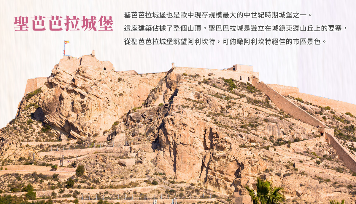 聖芭芭拉城堡也是歐中現存規模最大的中世紀時期城堡之一。這座建築佔據了整個山頂。聖巴巴拉城是聳立在城鎮東邊山丘上的要塞,從聖芭芭拉城堡眺望阿利坎特,可俯瞰阿利坎特絕佳的市區景色。