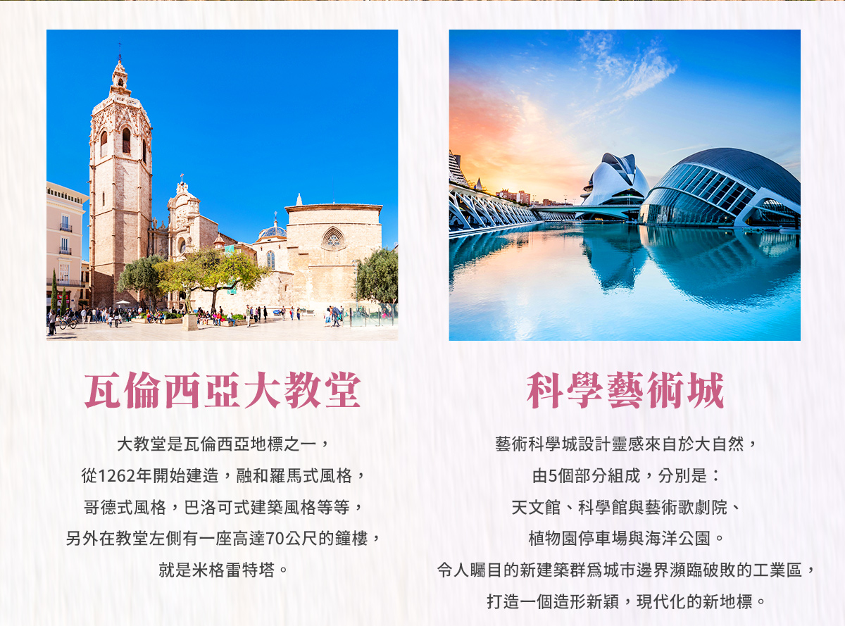 瓦倫西亞大教堂與米格雷特塔。大教堂是瓦倫西亞地標之一,從1262年開始建造,融和羅馬式風格,哥德式風格,巴洛可式建築風格等等,另外在教堂左側有一座高達70公尺的鐘樓,就是米格雷特塔。