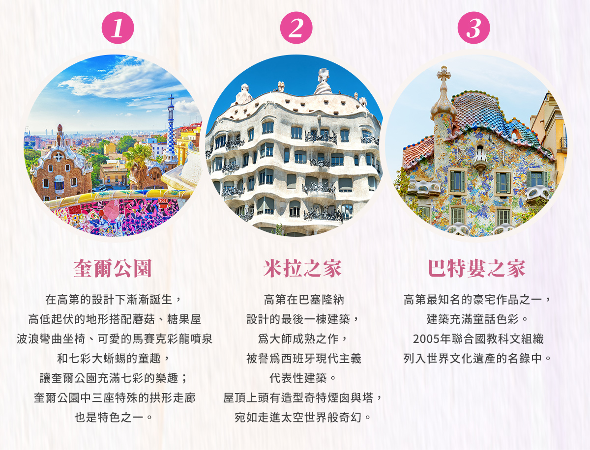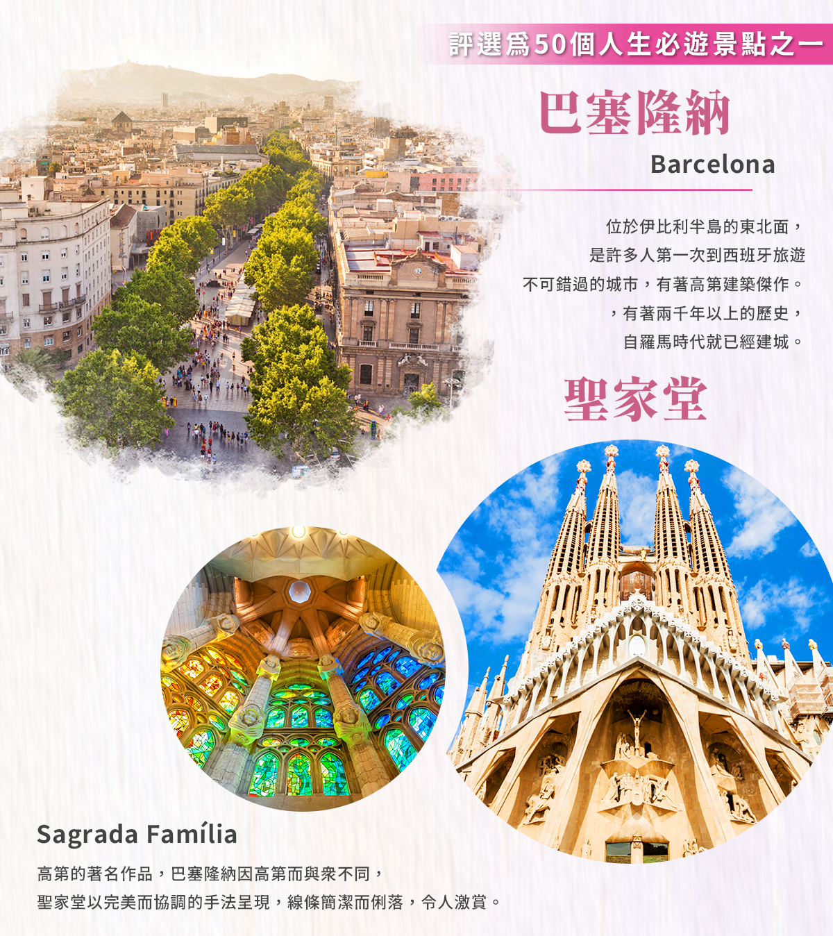 西班牙加泰隆尼亞巴塞隆納一座天主教教堂,位於巴塞隆納市中心,距今已動工百餘年卻仍未完工的教堂,為西班牙天才建築家─高第的代表作;聖家堂從1882年開始修建,因為是贖罪教堂,資金的來源主要靠個人捐款,世界上唯一一座還未完工就被列為世界遺產的建築物。建造風格帶有強烈的自然色彩,教堂共有三座宏偉的立面,東、西、南面各具特色,以完美而協調的手法呈現,線條簡潔俐落;門牆上的浮雕,出自雕塑家─蘇比拉什之手,一百多尊雕像全部源自《聖經》故事,從〈聖子的洗禮〉到〈最後的晚餐〉,一尊尊都精雕細刻,形同活物。如此獨特華麗,成了巴塞隆納最引以為傲的地標,成為巴塞隆納最為人所知的觀光景點,在1984年被聯合國教科文組織列為世界遺產,是世界上唯一一座在未完工時就被列入的建築。