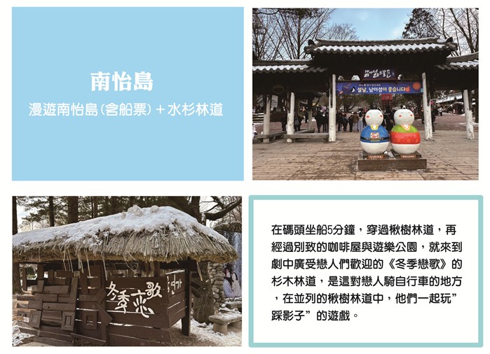 【南怡島遊船(含船票)~水杉林道~浪漫遊】位於北漢江上游,是面積14萬坪小島。這裡寬闊的草地和楸樹林道相得益彰、相映成趣。如果冬季下雪,這裡也會積下雪白浪漫;在碼頭坐船5分鐘,穿過楸樹林道,再經過別緻的咖啡屋與遊樂公園,就來到劇中廣受戀人們歡迎的《冬季戀歌》的杉木林道,是這對戀人騎自行車的地方,在並列的楸樹林道中,他們一起玩”踩影子”的遊戲。早晨或者黃昏時,從枝葉中滲進霞光非常美麗,劇中這對情人在草地堆雪人並開始第一次KISS的地方,來到韓國怎能不來這裡感受浪漫的氛圍呢!