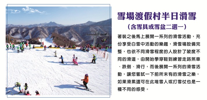 ❄️雪場渡假村半日滑雪(含雪具或雪盆二選一)❄️著裝之後馬上展開一系列的滑雪活動,充份享受白雪中活動的樂趣,滑雪場設備完整,也依不同滑雪程度的人設計了陂度不同的滑道,由開始學穿鞋到練習走路煞車、跌倒、滑行,而後展開一系列的滑雪活動,讓您嘗試一下前所未有的滑雪之樂,如果滑累還可在此堆雪人或打雪仗也是一種不同的感受。