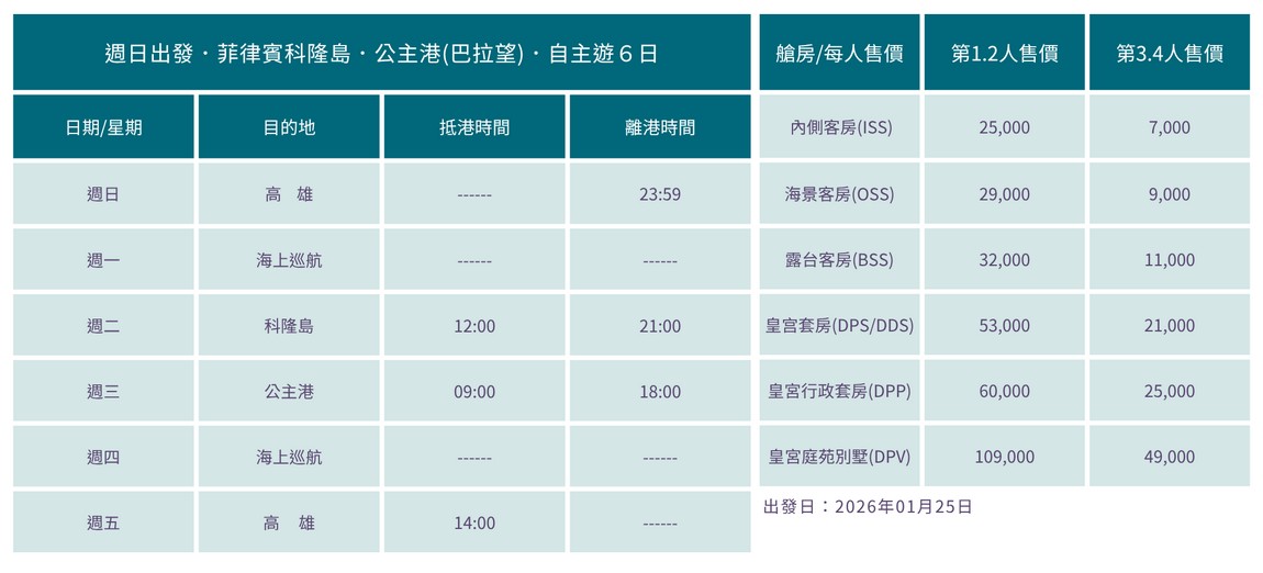 .6天航程《內側.海景.露臺》等艙房,每人訂金新台幣15,000元。