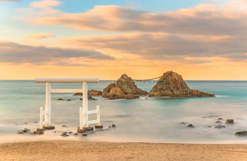 系島櫻井二見浦以潔白鳥居與夫妻岩聞名,鳥居佇立在沙灘上,與海中並立的兩塊巨石「夫妻岩」相映成景,形成浪漫且神聖的畫面。這裡被列為日本「百大海灘」,夕陽西下時更是絕景,也是祈求姻緣與幸福的熱門景點。