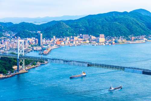 關門海峽大橋連接九州的北九州市與本州的下關市,是橫跨關門海峽的重要吊橋,全長約1公里,橋下可通航船隻,行車及觀景皆便利。橋上能俯瞰海峽壯麗景色,特別是夜晚燈光點綴時,更成為熱門拍照與觀光景點。