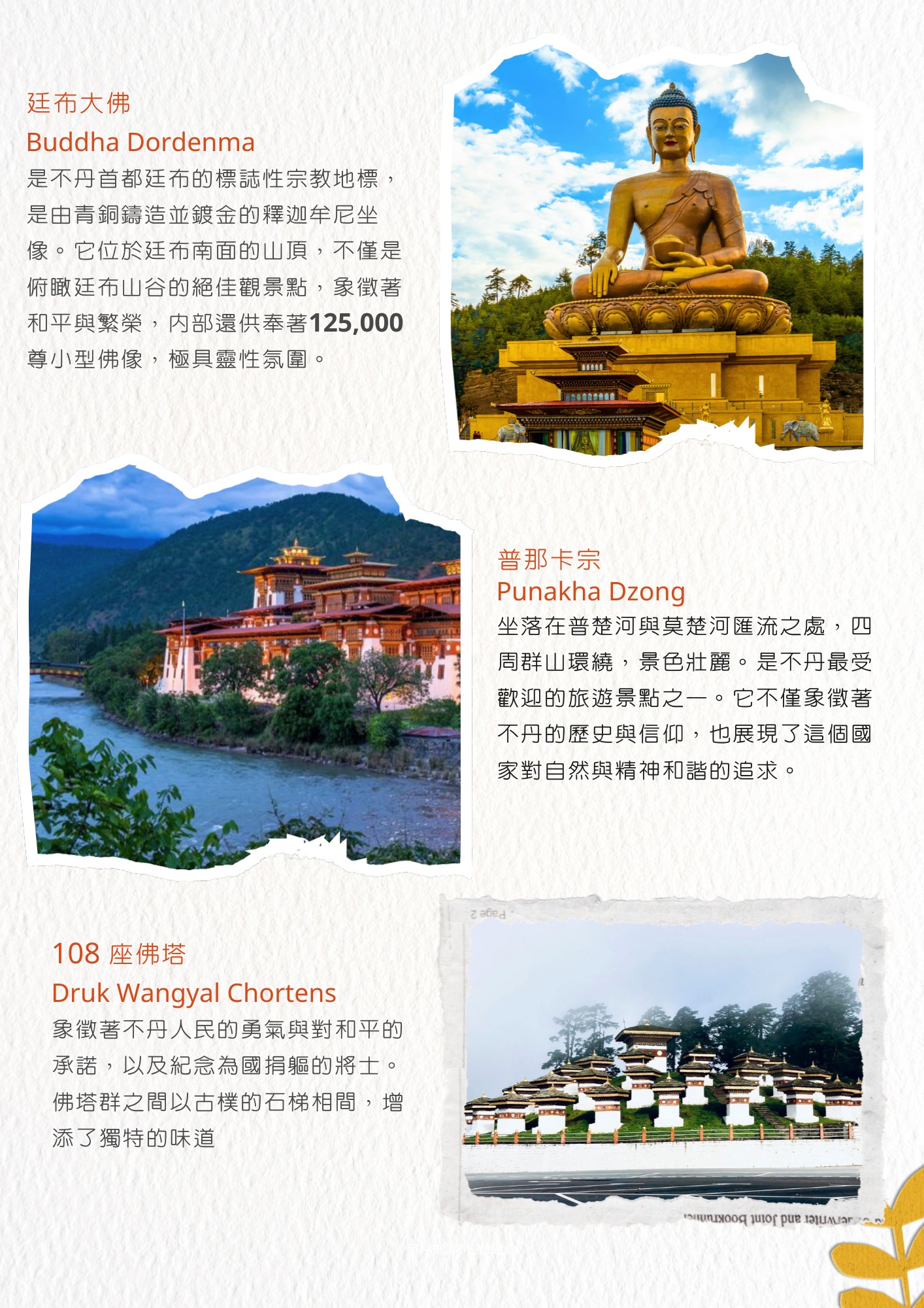 這108 座佛塔由不丹第四任國王吉格梅·辛格·旺楚克(King Jigme Singye Wangchuck)的 母親阿希·多吉·旺莫·旺楚克(Ashi Dorji Wangmo Wangchuck)於2003 年興建,為了紀念在對抗印度叛 軍行動中犧牲的不丹士兵,並祈求國家和平與繁榮。佛塔群不僅是宗教聖地,也是旅人前往普那卡途中最 受歡迎的停留點之㇐,象徵著和平、紀念與精神的淨化。