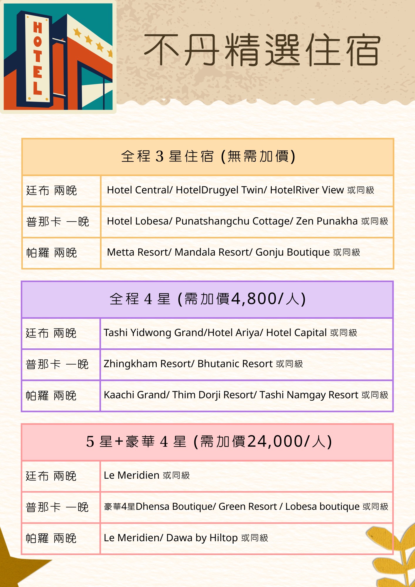 | 1 | 不丹住宿.加價升等全程4星酒店(兩人一室、每人費用) |