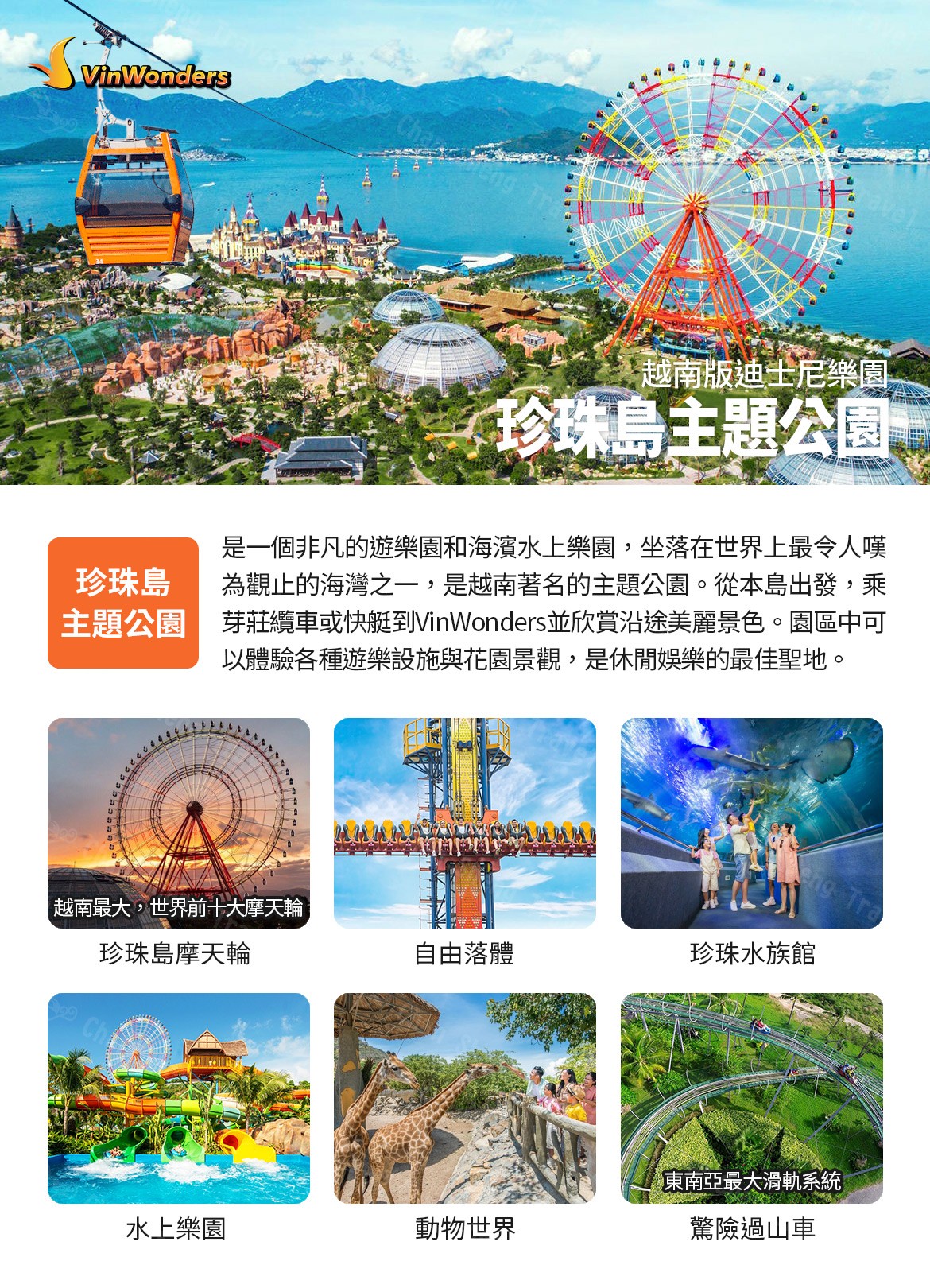 珍珠島水陸樂園渡假村(含樂園一票到底門票)越南最大的遊樂園,有東南亞迪士尼美稱精彩的樂園設施有: 過山車、自由落體、高山斜軌車、搖頭飛椅、大擺錘、礦山車等,摩天輪是樂園的新亮點(高200公尺),也是園區最新開放的熱區等活動精彩刺激,不限次數任君選擇。高山斜軌車是網紅推薦項目,一邊體驗刺激破表的速度,一邊欣賞芽莊灣美景喔!