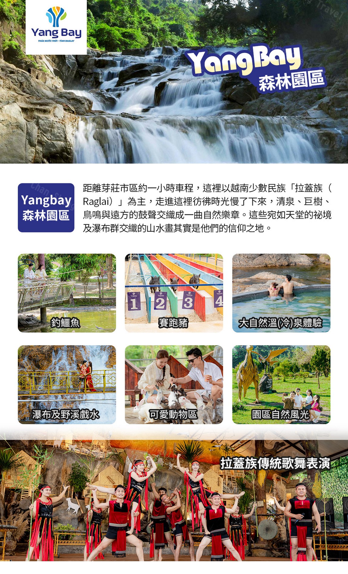 距離芽莊市區約㇐小時車程,這裡以越南少數民族「拉蓋族(Raglai)」為主, 走進這裡彷彿時光慢了下來,清泉、巨樹、鳥鳴與遠方的鼓聲交織成㇐曲自然樂章。這些宛如天堂的祕境 及瀑布群交織的山水畫其實是他們的信仰之地,Yang Bay 在當地的拉蓋族語為「天堂之瀑」的意思,傳說 這裡是天神降雨、萬物復甦之地,瀑布自高處奔流而下,如同銀白緞帶傾灌入蒼翠的叢林之中。