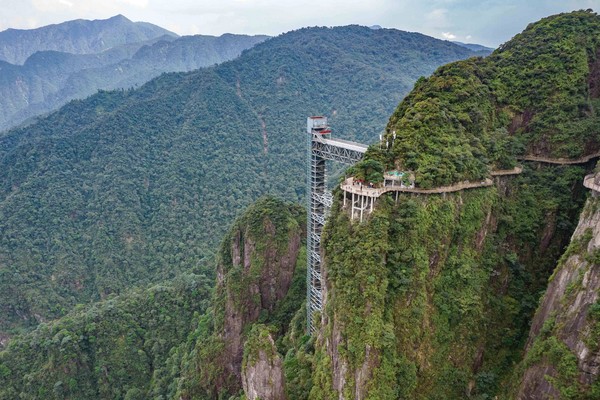 【懸崖觀光垂直電梯】建造在摩天嶺的山腰上站在這裏,往南邊看去,粵北的廣大山河盡收眼裏,電梯高度約五十 層樓高,電梯運行速度 3 米/秒,49 秒就可到達山頂,乘坐電梯時,石筍峰近在咫尺巧奪天工,莽山松、福建柏千姿百態、傲然挺立,奇松怪石雲海日出盡收眼底,摩天嶺電梯讓你遊覽莽山五指峰更輕鬆!