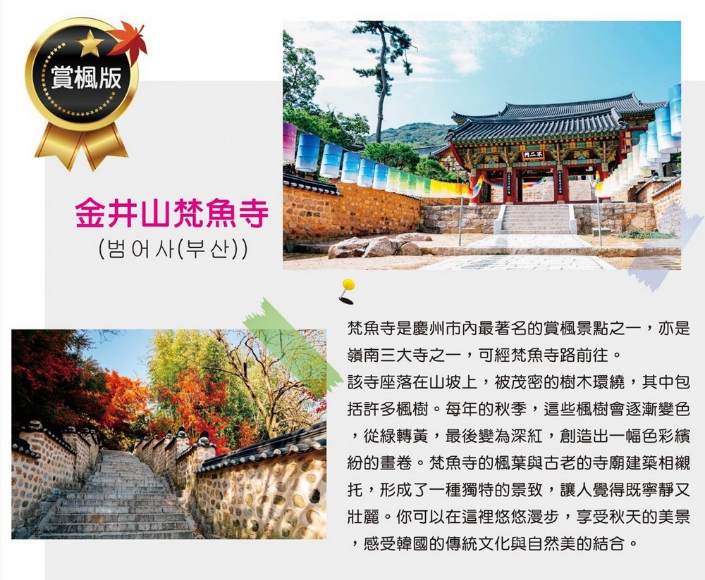 賞楓版就愛幸福釜山~東萊邑城+梵魚寺+金剛公園賞楓.迦耶王國主題樂園.海雲台+觀光列車.THEBAY101夜景五天
