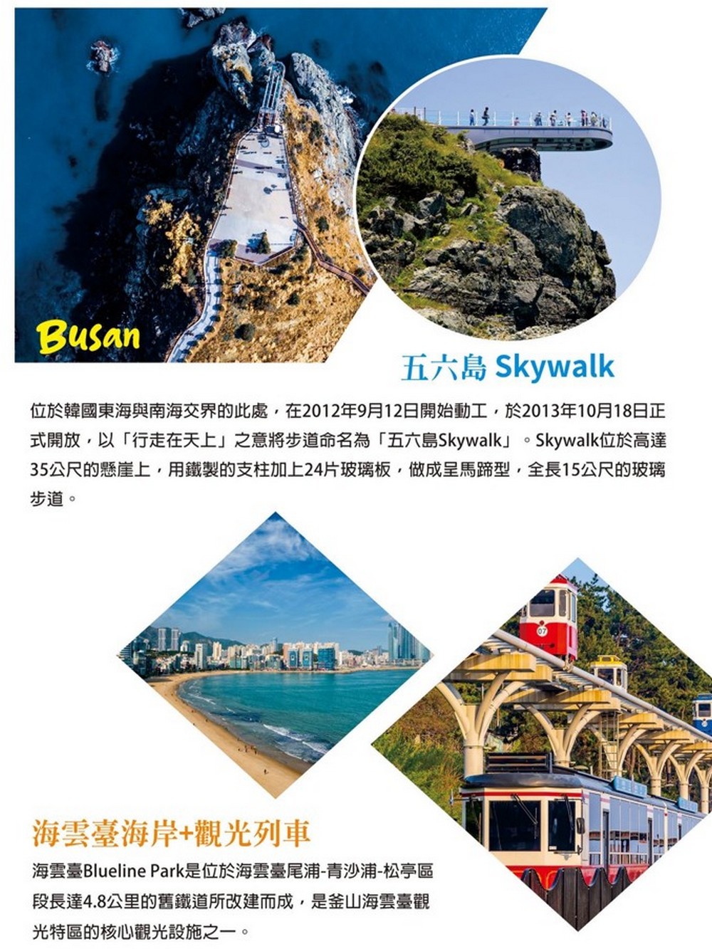 【海雲臺海岸+觀光列車】海雲臺Blueline Park是位於海雲臺尾浦-青沙浦-松亭區段長達4.8公里的舊鐵道所改建而成,是釜山海雲臺觀光特區的核心觀光設施之一。沿著海岸線一路延伸的鐵軌,可以搭乘海岸列車或天空艙欣賞美麗的海景。搭乘觀光列車可將東釜山的海景盡收眼底。