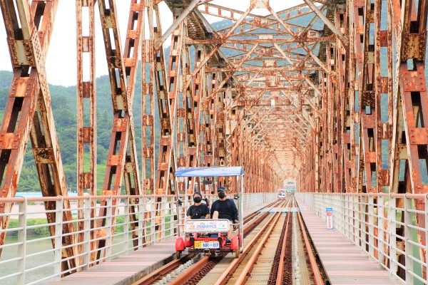 【金海洛東江鐵道自行車】全程來回約3公里,是穿越鐵橋,能飽覽洛東江景色的休閒運動。不僅能感受踩著鐵路自行車行經復古鐵橋的特別體驗,還可與附近的紅酒洞窟一併遊覽,更添樂趣。