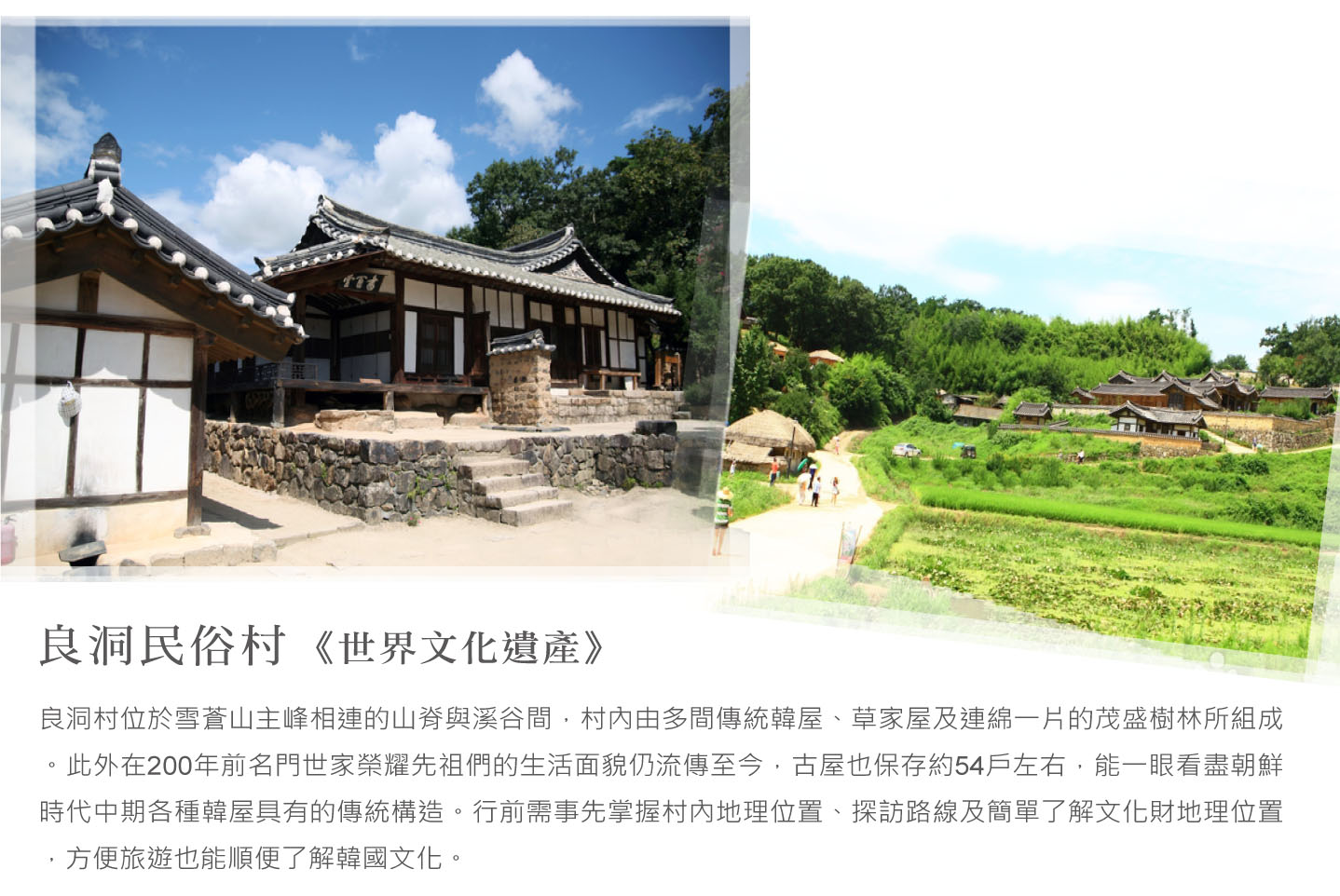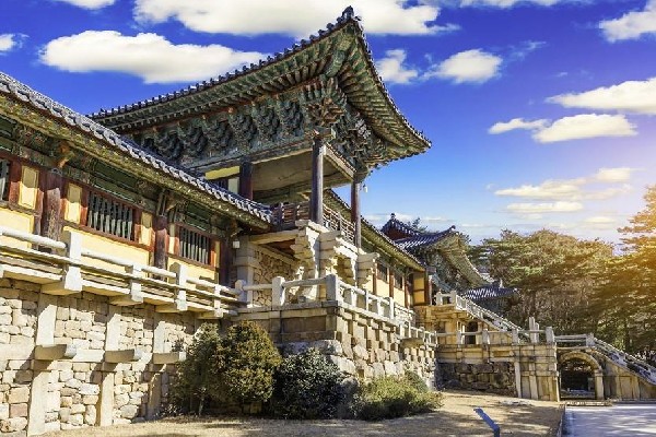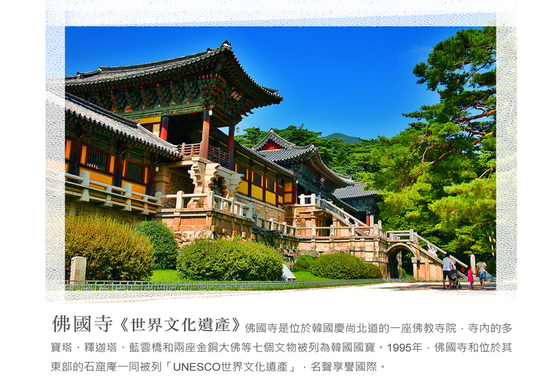 【佛國寺】1995年被指定為世界文化遺產,建於新羅時代的公元751,直至774年完工,雖歷經1500年歲月,卻能顯示出其精巧的石雕工藝,迴廊與大雄殿以鮮明的丹青塗飾,安置釋迦牟尼像的寶殿內部色彩華麗,多寶塔雕刻優雅美觀,釋迦塔、極樂殿、毗盧殿內的阿彌陀佛與毗盧舍那佛像等眾多的國寶與文化遺產都顯示著當時新羅文化的登峰造極。