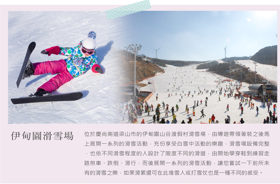 2. 滑雪時您可依個人需求自費租用雪衣、雪褲2項共約韓幣20,000元及雪鏡租用費約韓幣10,000元,或您亦可自行攜帶防水之禦寒衣物帽子以利滑雪時穿著保暖。