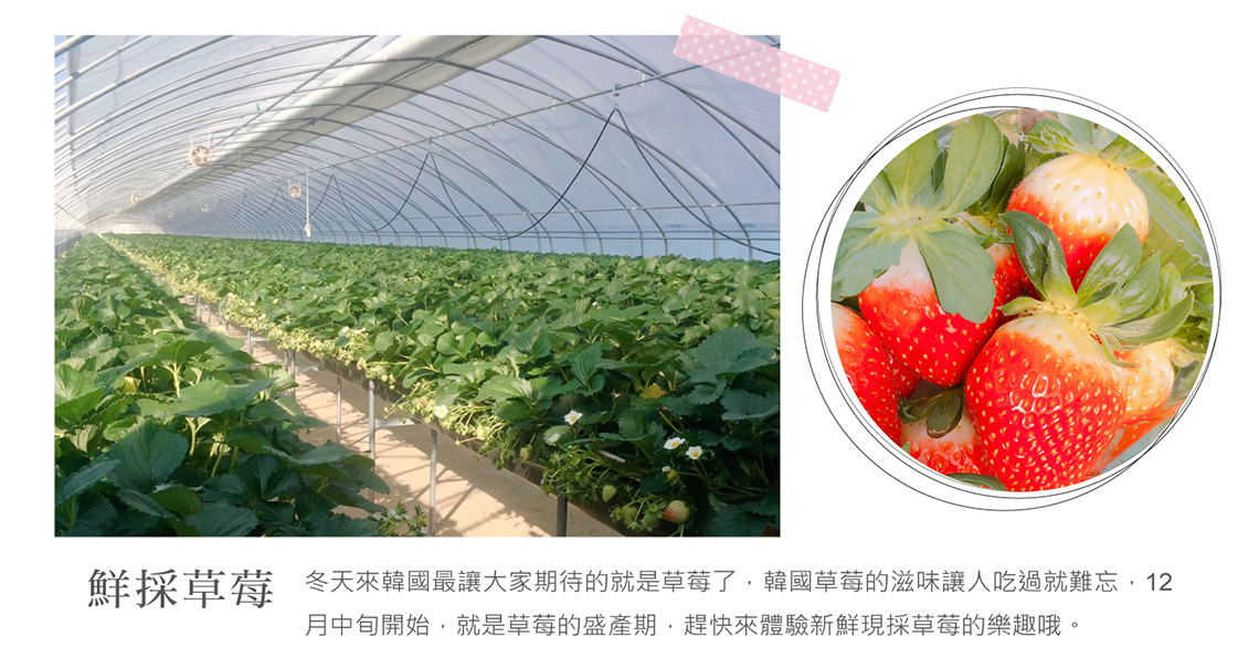 【鮮採草莓】冬天來韓國最讓大家期待的就是草莓了,韓國草莓的滋味讓人吃過就難忘,12月中旬開始,就是草莓的盛產期,趕快來體驗新鮮現採草莓的樂趣哦!