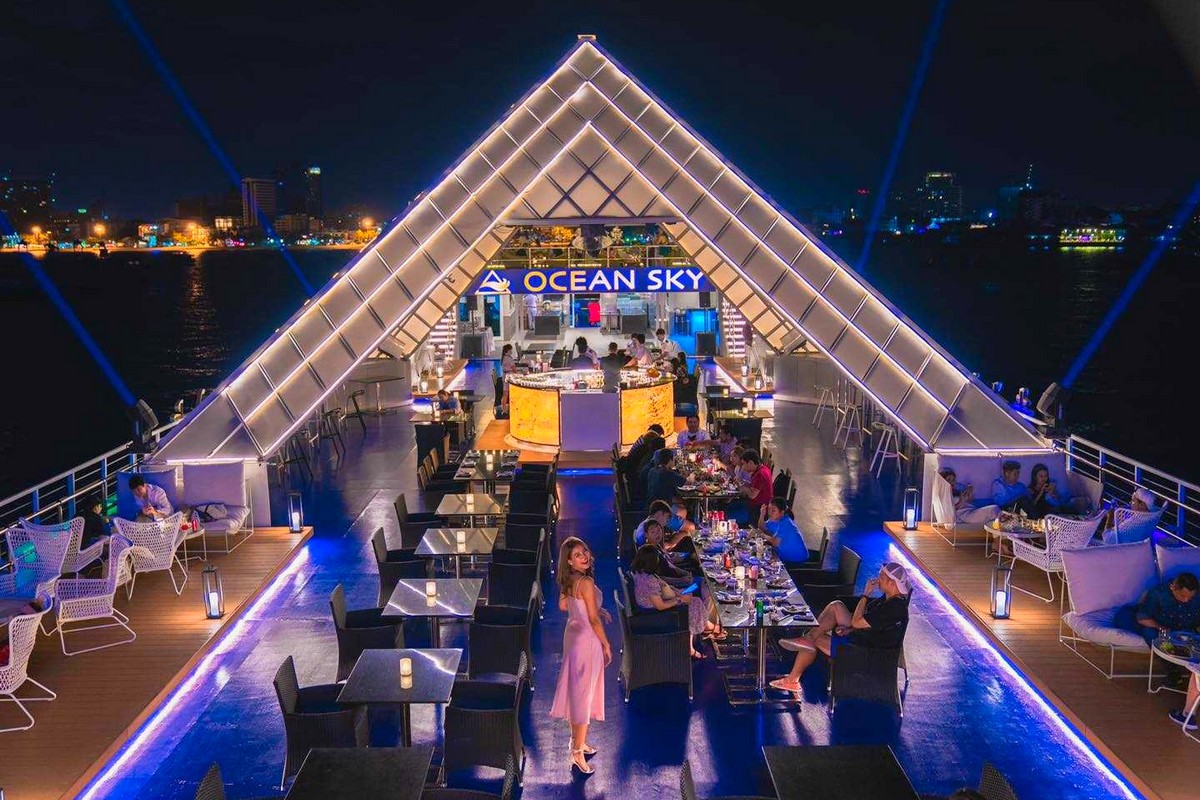 搭乘Ocean Sky Pattaya,好似芭達雅海面上的飄浮酒吧;這趟獨特的郵輪之旅提供美味自助餐,包含最道地的泰國美食以及多款國際佳餚,等您來品嚐。除了餐點之外,Ocean Sky Pattaya 還為您獻上一場精彩絕倫的表演,舞姿曼妙的選美人妖,與媲美偶像男團等級的猛男舞團,搭配換裝、無冷場的完整舞蹈表演與互動,保證為您帶來極具娛樂性和難忘的夜晚。