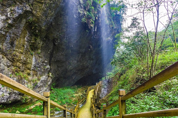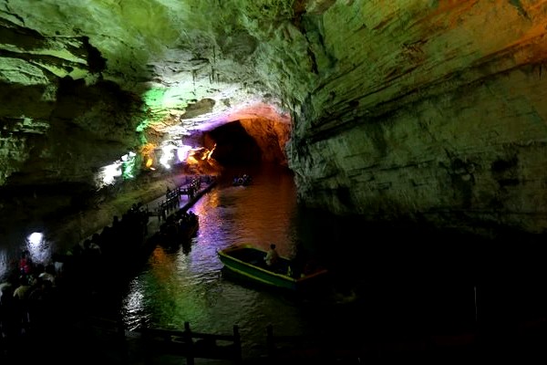 【黃龍洞含遊船】又稱黃龍泉, 屬石灰岩地下河侵蝕型洞穴。兩層水洞與兩層旱洞上下縱橫,形成洞下洞,樓上樓螺旋結構,最大洞廳的面積12000平方米,可容納上萬人。