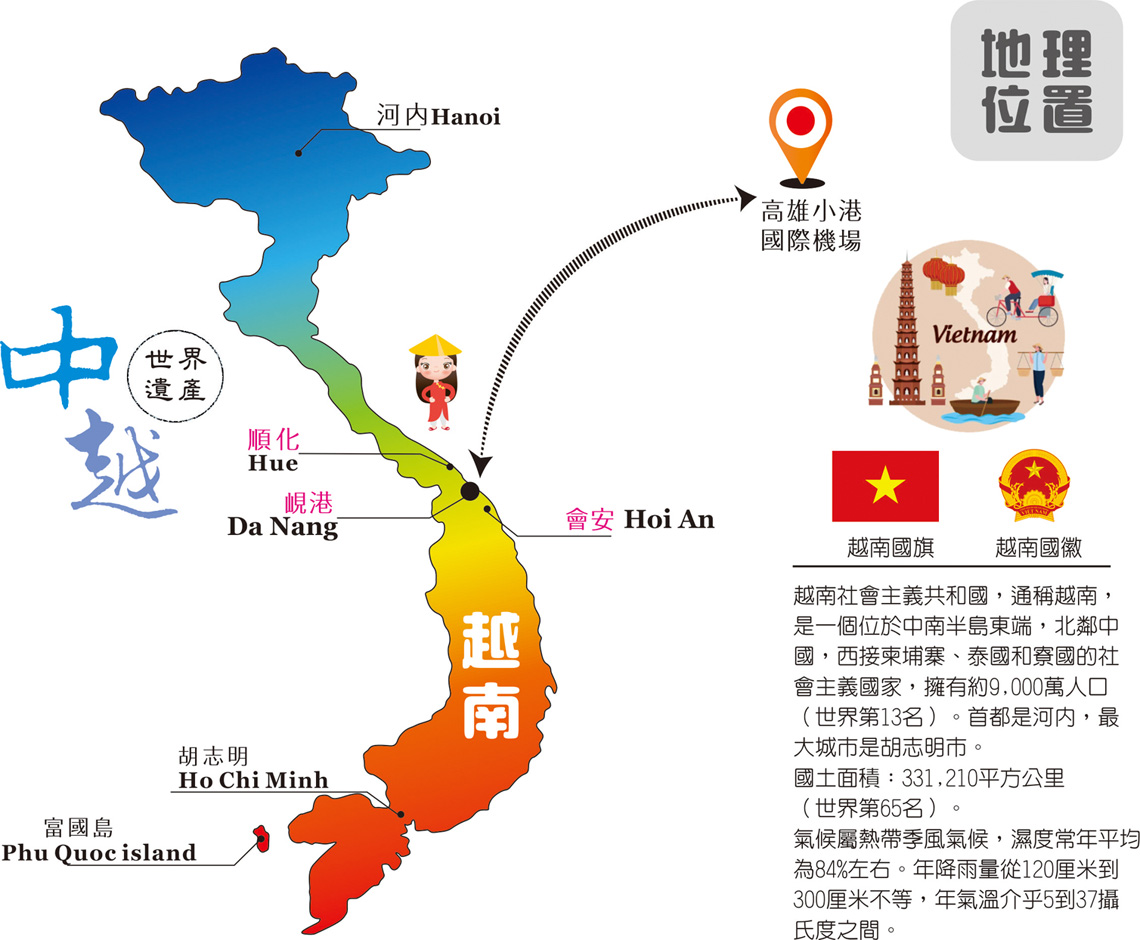 .時差:越南全境同屬一個時區,格林威治標準時間+7小時(比台灣慢一小時)。