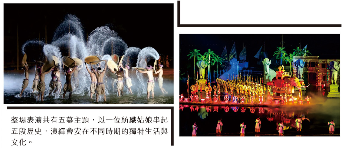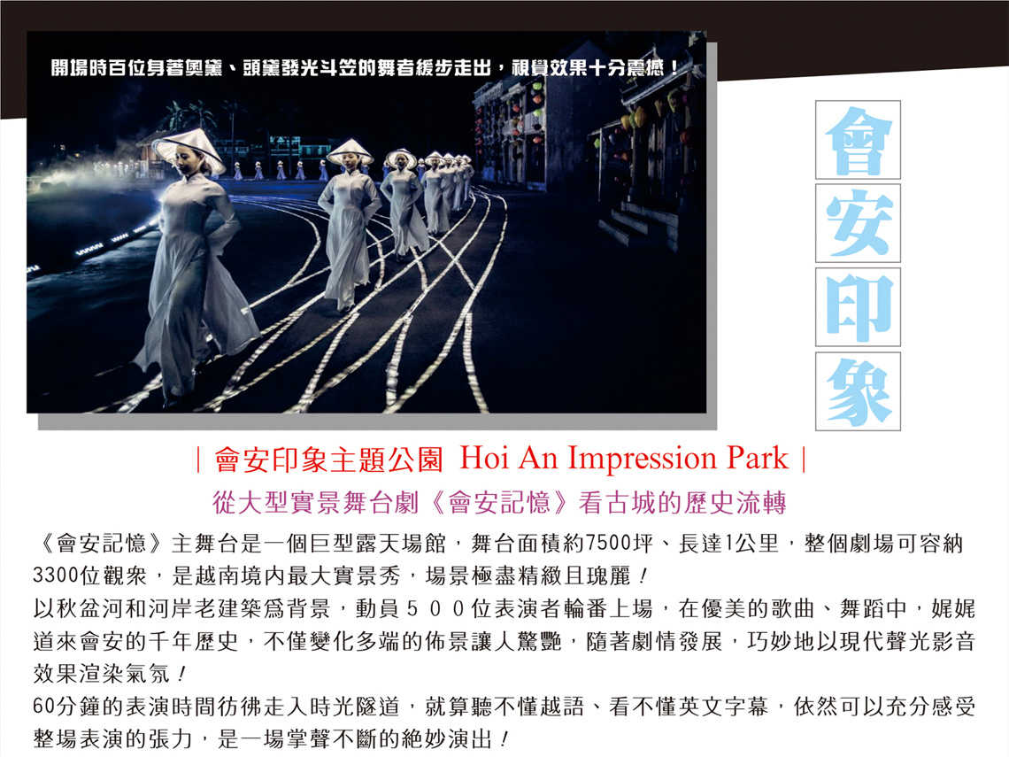 主舞台是一個巨型露天場館,舞台面積約7500坪、長達1公里,整個劇場可容納3300位觀眾,是越南境內最大實景秀,場景極盡精緻且瑰麗,以秋盆河和河岸老建築為背景,動員500位表演者輪番上場,在優美的歌曲、舞蹈中,娓娓道來會安的千年歷史,不僅變化多端的佈景讓人驚艷,隨著劇情發展,巧妙地以現代聲光影音效果渲染氣氛,60分鐘的表演時間彷彿走入時光隧道,就算聽不懂越語、看不懂英文字幕,依然可以充分感受整場表演的張力,是一場掌聲不斷的絕妙演出!