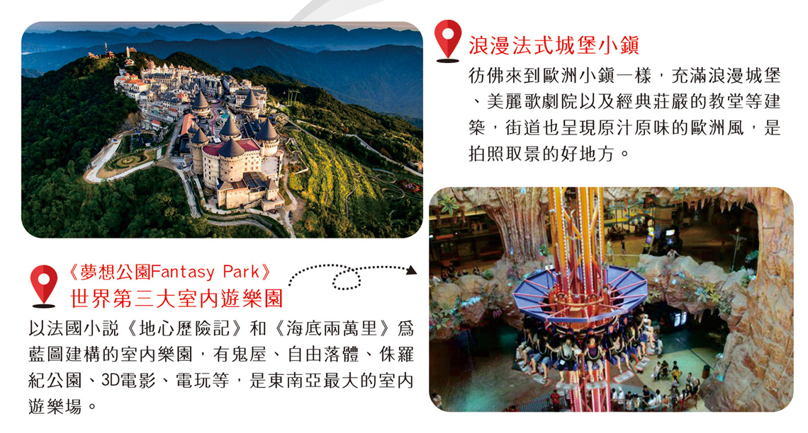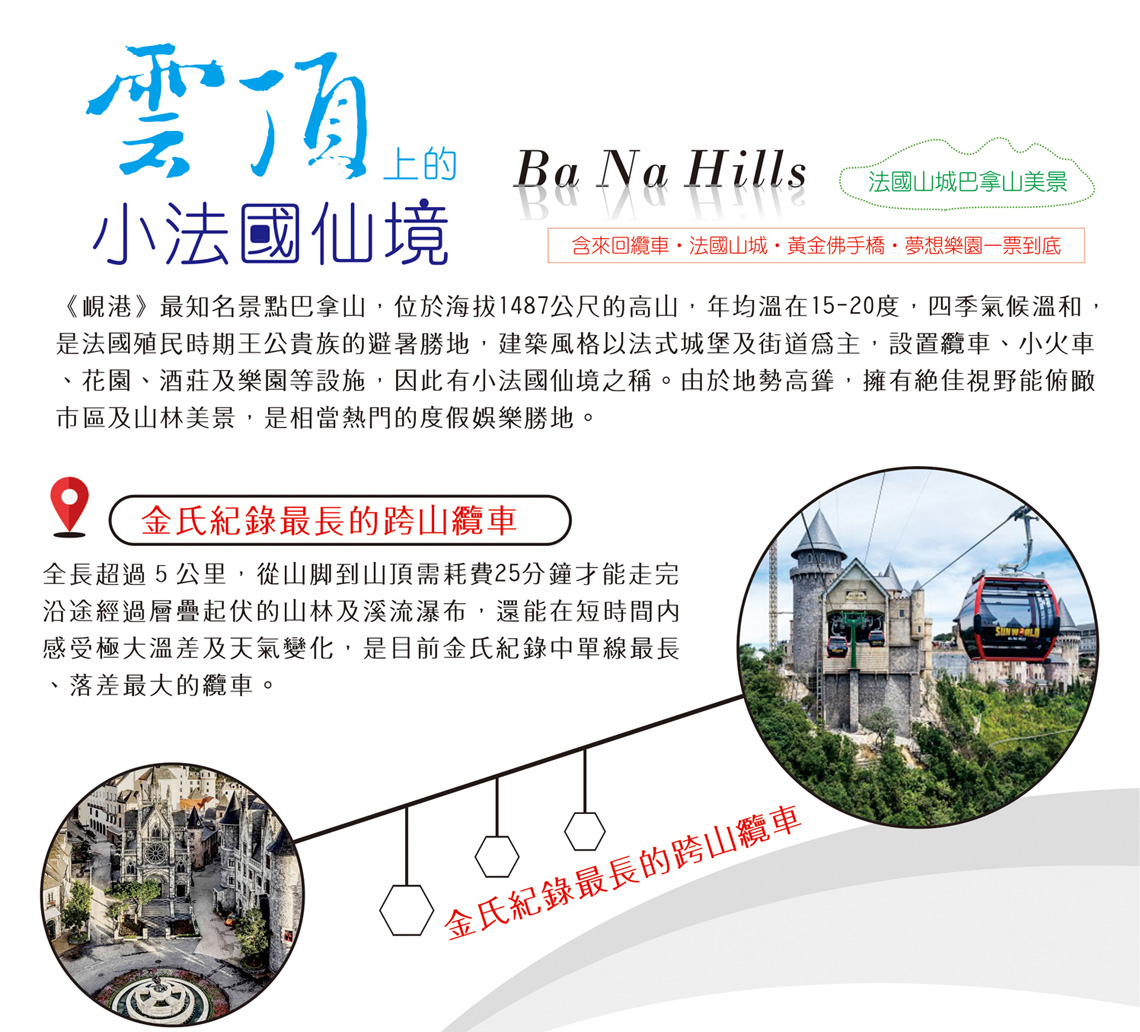 峴港-(車程約60分)-巴拿山法國山城:搭乘世界最長纜車來回、黃金佛手橋(熱門IG打卡點)、巴拿山世界三大室內娛樂公園、巴拿山小火車-峴港-(車程約50分)-會安