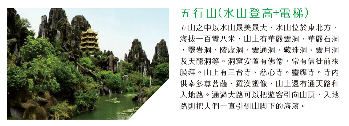 位於峴港市區東邊七公里處有座五行山,傳說有神仙住過,因此整座山都是香的,非常神奇。五行山原為海中島,多少年的變遷成了陸地上的山。一開始名為五蘊山、五指山,西面有翰江,東面臨南中國海,在海邊平坦的沙灘上,水、木、火,金、土六座山峰(其中火山為雙峰)拔地而起,氣勢雄偉。由於風光秀麗。古人有詩寫道:「何處景色勝五行,不遜仙境是蓬萊。山光彩石峰浴翠,古寺香霧繞雲岩。」五山之中以水山最美最大,水山位於東北方,海拔一百零八米,山上有華嚴雲洞、華嚴石洞,靈岩洞、陵虛洞、雲通洞、藏珠洞、雲月洞及天龍洞等。洞窟安置有佛像,常有信徒前來膜拜。山上有三台寺、慈心寺。靈應寺。寺內供奉多尊菩薩、羅漢塑像,山上還有通天路和入地路。通過大路可以把遊客引向山頂,入地路則把人們一直引到山腳下的海濱。